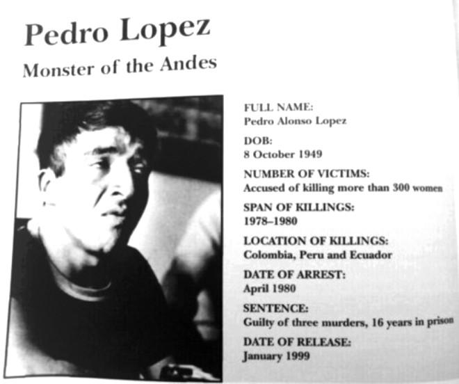 1980-ci ildə Amerikada 12 yaşında bir qızı qaçırmaq istəyərkən tutulub. Buna qədər isə öldürüb basdırdığı 53 qurbanın cəsədləri polis tərəfindən aşkarlanıb. Onların hər biri fərqli yerlərdə basdırılmışdı. Həbs edilən Pedro Lopez Kolumbiya hökumətinə təhvil verilib. Polislərə daha cinayət işləməyəcəyinə dair and içən Pedro Lopez hökumət tərəfindən sərbəst buraxılıb.