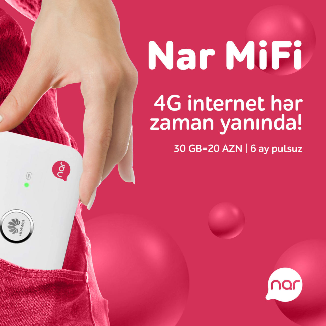 Ölkənin ən gənc və innovativ mobil operatoru "Nar" yüksəksürətli internetə çıxış imkanı verən "Nar MiFi" paketini təqdim edir. "Nar MiFİ" paketinə aylıq 30 GB olmaqla 6 aya qədər yüksəksürətli internet və daşınabilən MiFi cihazı daxildir. "Nar MiFi" paketinin ilkin qiyməti 120 AZN təşkil edir. Paketin daxilindəki pulsuz internet bitdikdən sonra, abunəçilər aylıq 20 AZN ödəməklə, 30 GB internet əldə edəcəklər.