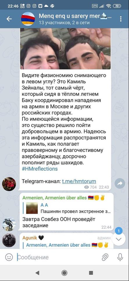 Sözügedən kadrları paylaşan ermənilər Kamilin öldürülməsi ilə bağlı Telegram kanallarında mesajlar verir.