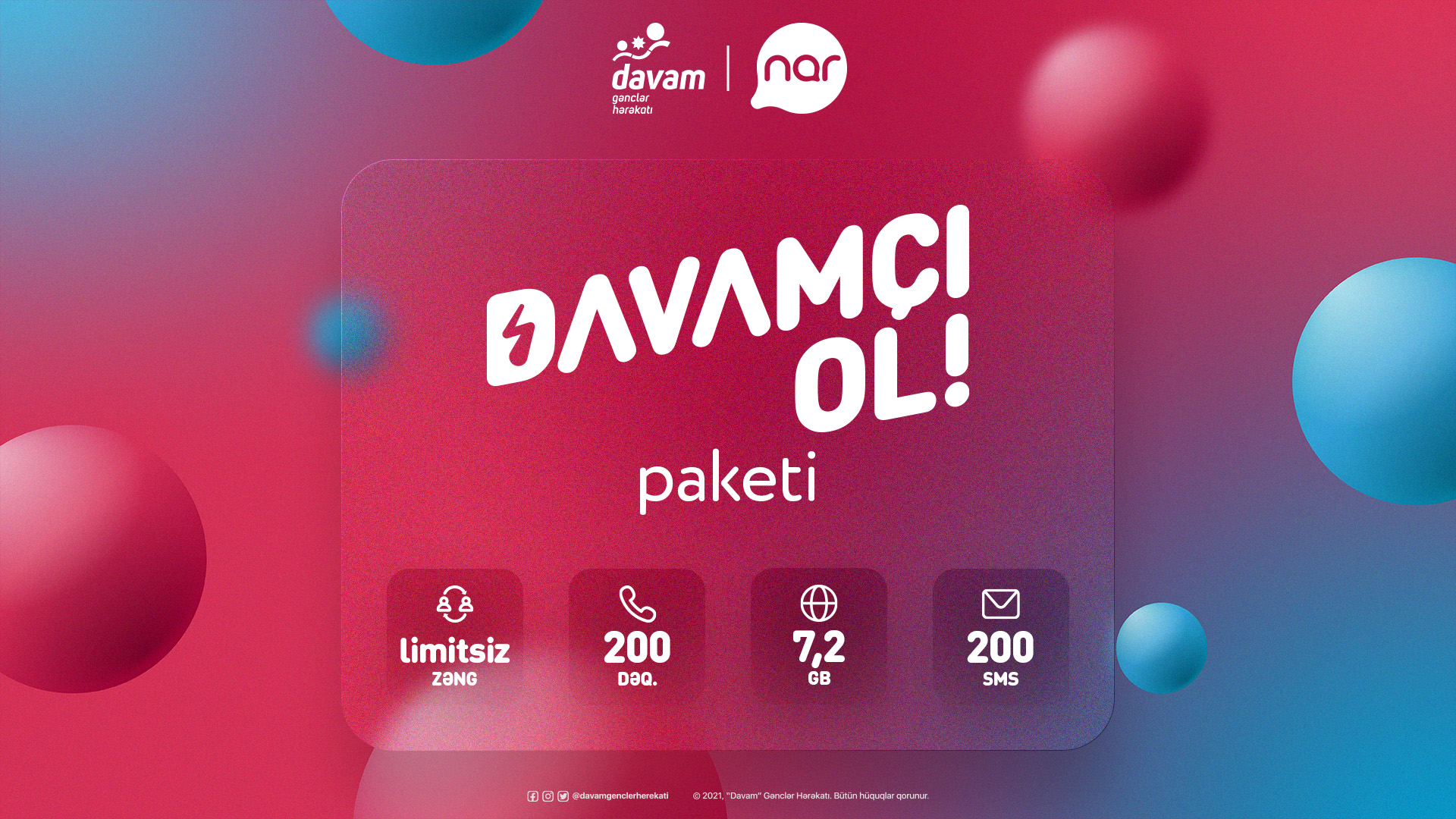 Paket "Davam" Gənclər Hərəkatının üzvləri arasında limitsiz və pulsuz danışıq imkanı yaratmaqla yanaşı, ölkədaxili bütün istiqamətlərə 200 dəqiqə, 200 SMS və 7,2 GB internet trafiki təqdim edir.