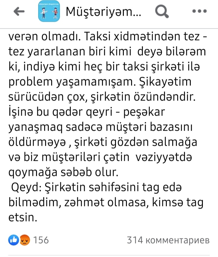 Taksi xidmətindən tez - tez yararlanan biri kimi deyə bilərəm ki, bu günədək heç bir taksi şirkəti ilə problem yaşamamışddım. Əslində şikayətim sürücüdən çox, şirkətin özündəndir. İşinə bu qədər qeyri - peşəkar yanaşmaq sadəcə müştəri bazasını dağıtmağa, şirkəti gözdən salmağa və biz müştəriləri çətin vəziyyətdə qoymağa səbəb olur.”