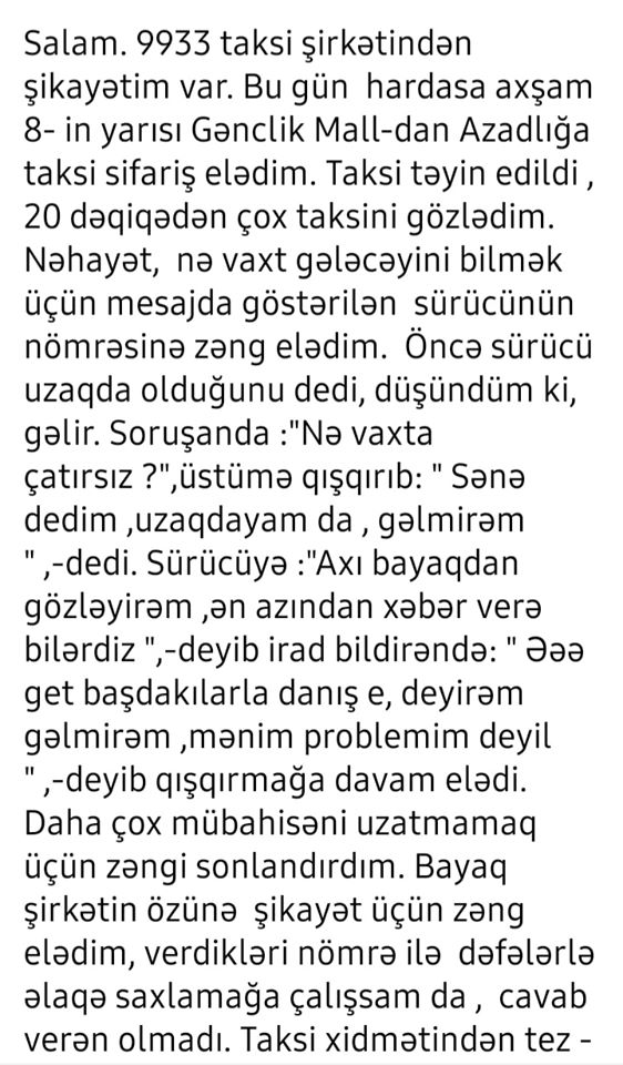 Sosial şəbəkədə özünü Məhəbbət S-va kimi təqdim edən istifadəçi "Müştəriyəm Şikayətim Var” qrupuna *9933 kimi tanınan "Salam Taksi" şirkətindən şikayət edib.