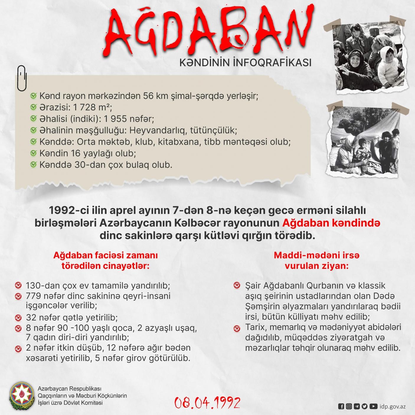 1992-ci il aprelin 7-dən 8-nə keçən gecə ermənilər tərəfindən Kəlbəcər rayonunun 130 evdən ibarət Ağdaban kəndi tamamilə yandırılıb və yer üzündən silinib. Kəndin 779 nəfər dinc sakininə işgəncələr verilib, 67 nəfər qətlə yetirilib, 8 nəfər 90-100 yaşlı qoca, 2 azyaşlı uşaq, 7 qadın diri-diri yandırılıb.