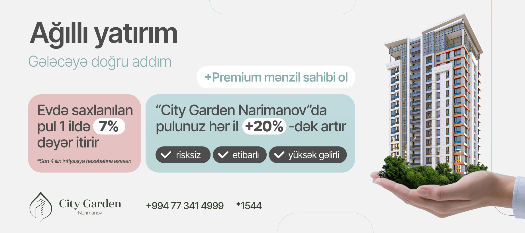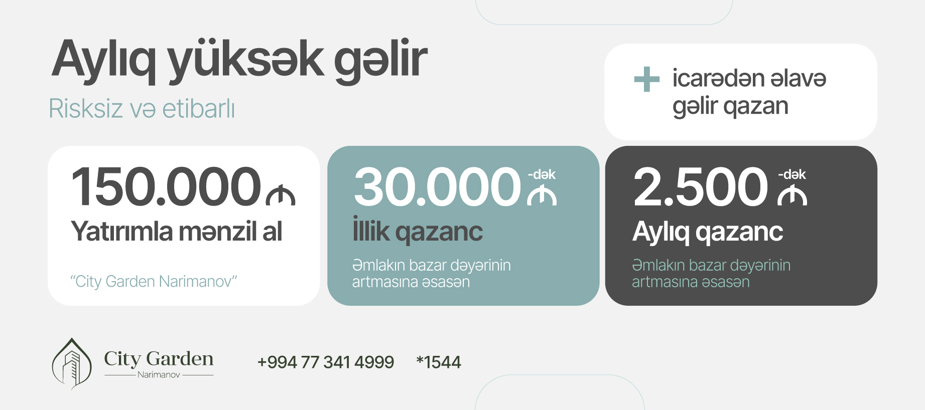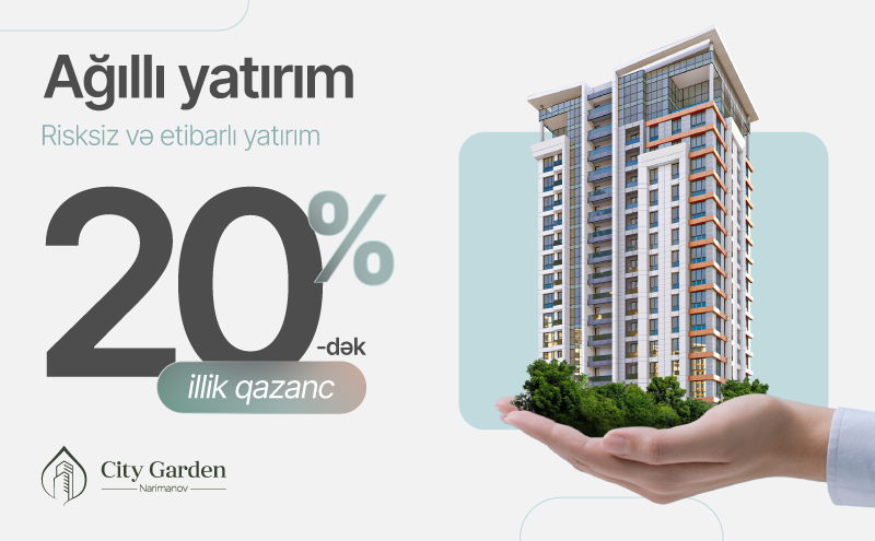 Hazırda 1-ci hissəsinin 80%-i inşa edilmiş meqa yaşayış kompleksi "City Garden Narimanov” layihəsi sizə illik 20%-dək qazanc gətirə bilən "Ağıllı Yatırım” imkanı təklif edir. Pulunuzu nə evdə saxlayın, nə də dəyərdən salacaq vasitələrə əl atın. "City Garden Narimanov”a investisiya edərək sərvətinizə dəyər qatın. Sadəcə 150 000 manatlıq yatırımla illik 30 000 AZN-dək gəlir əldə edin.