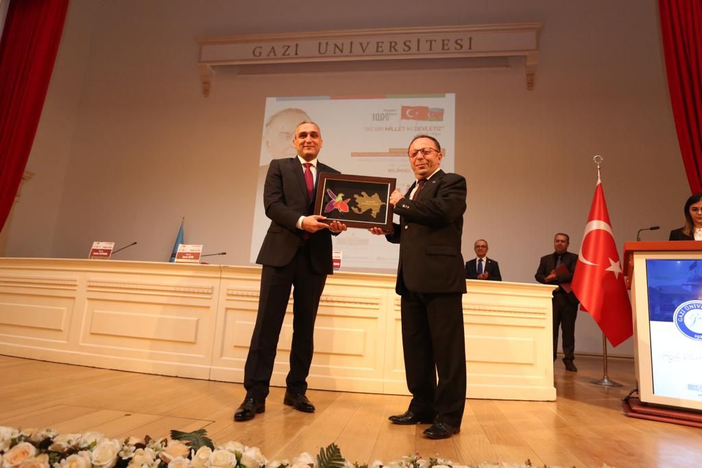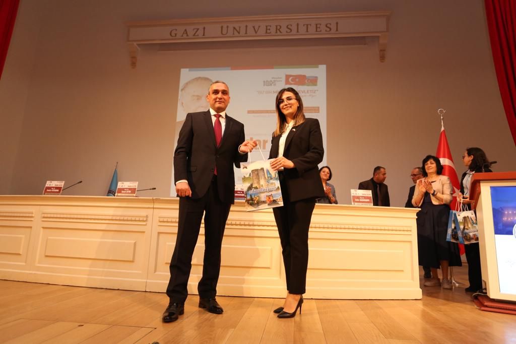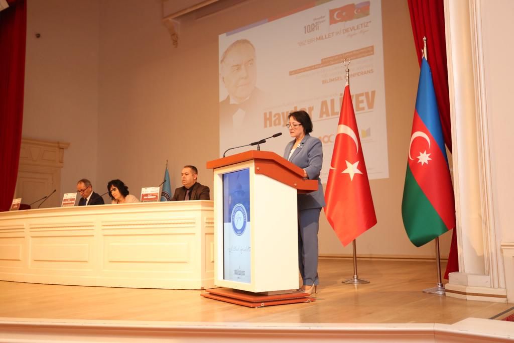 Qazi Universiteti rektoru Musa Yıldızın salamlarını çatdıran bu ali təhsil müəssisəsinin prorektoru Yücel Gelişli ortaq elmi konfransın əsas məqsədindən və önəmindən danışıb. Ulu Öndər Heydər Əliyevin qlobal liderlik keyfiyyətlərinə malik olduğunu vurğulayan prorektor görkəmli dövlət xadiminin çoxşaxəli, zəngin həyat və fəaliyyətində Türk Dünyasının xüsusi və mühüm yerə sahib olduğunu diqqətə çatdırıb. Bu il Türkiyə Respublikasının yaranmasının 100 illiyinin tamam olduğunu bildirən Y.Gelişli hər iki yüzilliyin sevincini özündə ehtiva edən belə bir tədbirə Qazi Universitetinin evsahibliyi etməsindən məmnunluğunu ifadə edib. İki universitet arasında əməkdaşlığın vacibliyindən bəhs edən Y.Gelişli MDU və Qazi Universiteti arasında müntəzəm olaraq təşkil edilən ortaq konfransların işbirliyinin inkişafına əhəmiyyətli töhfə verdiyini deyib, təşkilatçılara və məruzəçilərə təşəkkürünü bildirib.