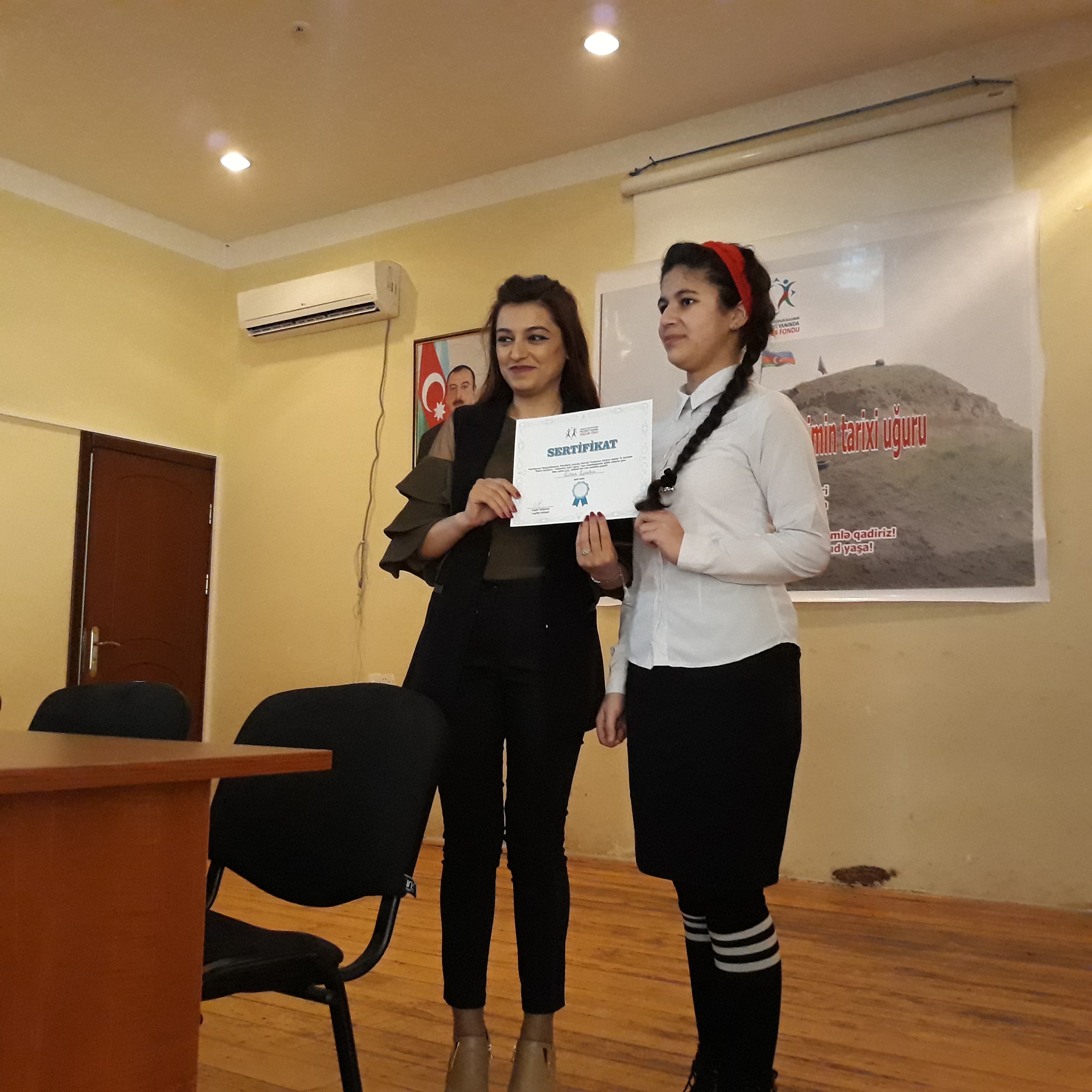 "Aprel döyüşləri – Vətənimin tarixi uğuru” layihəsi çərçivəsində fevralın 22-də Binəqədi rayonundakı 244 nömrəli tam orta məktəbin şagirdləri arasında inşa müsabiqəsi keçirilmişdir. Bununla əlaqədar təşkil edilmiş tədbirdə çıxış üçün ilk olaraq sözügedən məktəbin təlim-tərbiyə işləri üzrə direktor müavini Sevinc Süleymanova sözə başlamış, o, bu layihəni Azərbaycan Respublikasının Prezidenti yanında Gənclər Fondu tərəfindən şanlı tarixi səhifələrimizdən olan Aprel döyüşləri zamanı şəhid olmuş igidlərimizin əziz xatirəsinə göstərilən böyük hörmət əlaməti kimi dəyərləndirmiş, rəşadətli ordumuzun torpaqlarımızı cənab Prezidentimiz, Ali Baş Komandan İlham Əliyevin rəhbərliyi altında işğaldan azad edəcəyinə əmin olduğunu bildirmişdir. Daha sonra Azərbaycanın ərazi bütövlüyünün qorunub saxlanılması uğrunda canını fəda etmiş həmvətənlərimiz bir dəqiqəlik sükutla yad edilmişdir. Bir dəqiqəlik sükutdan sonra layihə rəhbəri Leyla Vəliyeva nitq söyləmiş, o, öz çıxışında məlum Aprel döyüşləri zamanı mərd oğullarımızın göstərdiyi böyük qəhrəmanlıq və şücaətdən, Cocuq Mərcanlı kəndinin əsarətdən qurtuluşundan və həmin əzəli yurda qayıdışdan bəhs etmiş, şagirdlərə müsabiqədə uğurlar arzulamışdır. Leyla Vəliyevanın çıxışının ardınca şagirdlər arasında inşa müsabiqəsinə start verilmişdir.