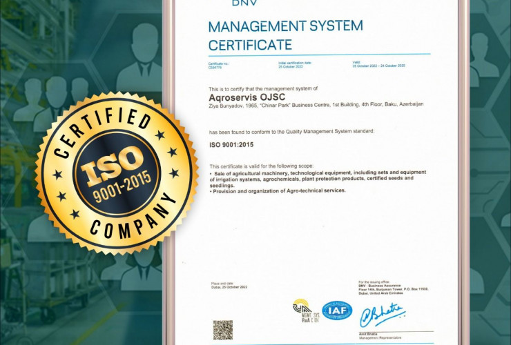 ISO 9001:2015 sertifikatına sahib olmaq "Aqroservis” ASC-nin davamlı olaraq yüksək standartların tətbiqində maraqlı olmasının göstəricisidir. Bu sertifikat "Aqroservis” ASC-nin fəaliyyətinin İSO 9001:2015 keyfiyyətli idarəetmə sisteminin standartlarına uyğun olduğunu təsdiq edir. Həmçinin, ISO 9001:2015 sertifikatı ASC-nin əsas fəaliyyəti olan kənd təsərrüfatı texnikası, texnoloji avadanlıqlar o cümlədən suvarma sistemi avadanlıqları, aqrokimyəvi maddələr, bitki mühafizə vasitələri, sertifikatlı toxumlar və tinglərin satışı, aqrotexniki xidmətlərin göstərilməsi və təşkilini sahəsində xidmətlərin keyfiyyətinin daha da yüksəldilməsinə zəmin formalaşdırır.