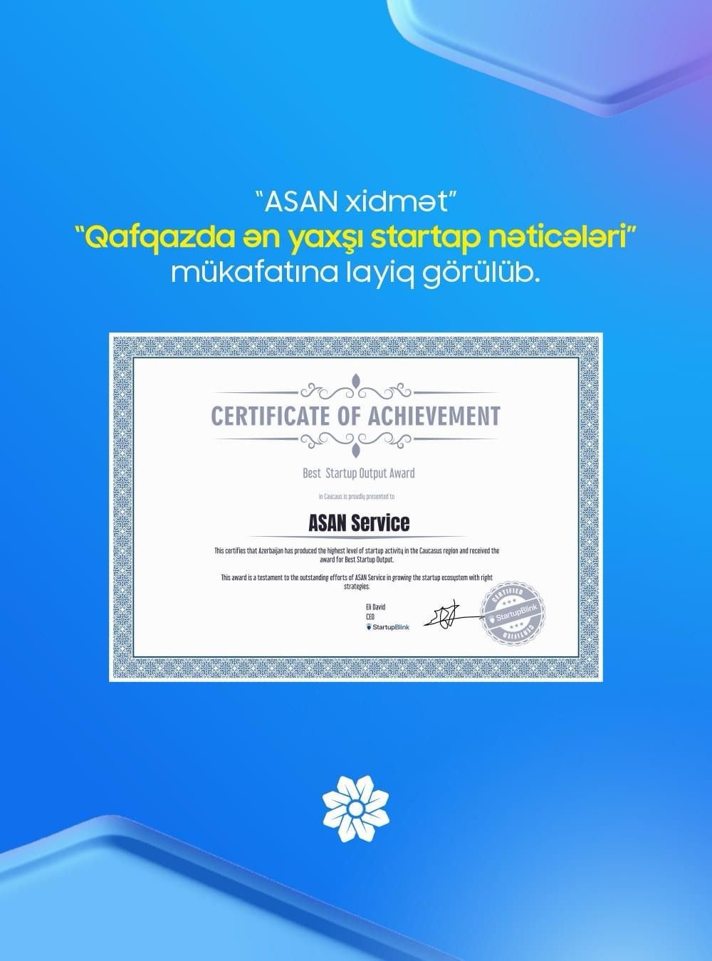 Bu il isə "ASAN xidmət” "INNOLAND” İnkubasiya və Akselerasiya Mərkəzi vasitəsilə innovasiya ekosisteminin inkişafına və startaplara dəstək mexanizmlərinin təşviqinə görə "Qafqazda ən yaxşı startap nəticələri” mükafatına layiq görülüb.