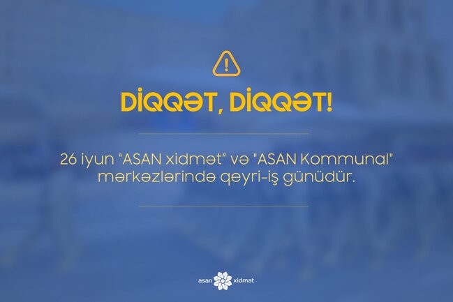 26 iyun - Azərbaycan Respublikasının Silahlı Qüvvələri günü ilə əlaqədar "ASAN xidmət” və "ASAN Kommunal" mərkəzlərində qeyri-iş günüdür.