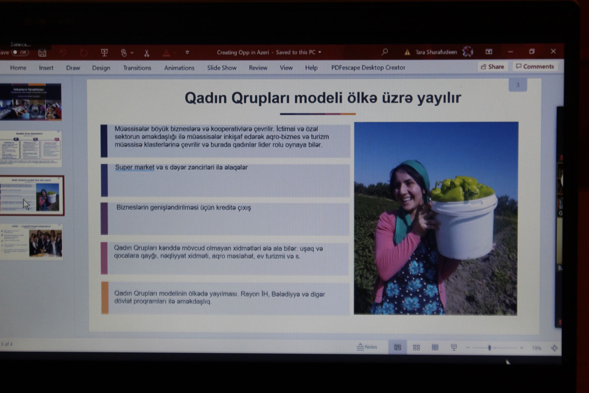 Dünya Bankının mütəxəssisi Tara Şarafuddin QİMQ-ları layihəsi haqqında təqdimatla çıxış edərək layihənin dünyanın 25 ölkəsində reallaşdırıldığını, 55 milyon qadının bu modelə cəlb olunduğunu qeyd edib. 30 ildir ki, fəaliyyət göstərən modelin, Azərbaycan qadınlarının aktiv, yeniliyə açıq, çalışqanlıqları sayəsində Azərbaycanda da çox uğurla tətbiq olunduğu vurğulanıb, bu modelin Qarabağda həyata keçiriləcək quruculuq işlərində də faydalı olacağı bildirib.