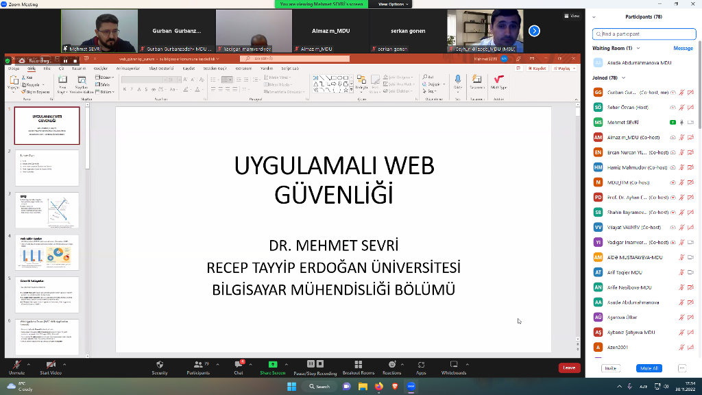 Sonra, MDU-nun Mühəndislik fakültəsinin dekan əvəzi dosent Almaz Əliyevanın moderatorluğu ilə konfransın məruzələri dinlənilib. İlk konfrans günündə Qazi Universitetindən professor Ayhan Erdem "Kibertəhlükəsizliyin əhəmiyyəti”, professor Ercan Yılmaz "Nüfuzetmə testləri”, Azərbaycan Texniki Universitetindən dosent Yadigar İmamverdiyev "Sənaye idarəetmə sistemlərinin informasiya təhlükəsizliyi”, İstanbul Gelişim Universitetinin əməkdaşı, GPEN serifikatlı mütəxəssis Serkan Gönen "Kibertəhlükəsizlik üzrə maarifləndirmə”, Receb Tayyip Erdoğan Universitetinin əməkdaşı Mehmet Sevri "Tətbiq olunan Web təhlükəsizliyi”, MDU əməkdaşı Elçin Tağıyev "Beşinci sənaye inqilabı: rəqəmsal texnologiyalar və süni intellekt”, "TIM Group” şirkətlər qrupunun təsisçisi, ORACLE sertifikatlı mütəxəssis Teymur Hacıyev "DATA sızması: təhdidlər və təhlükələr” mövzusunda məruzlərlə çıxış ediblər.