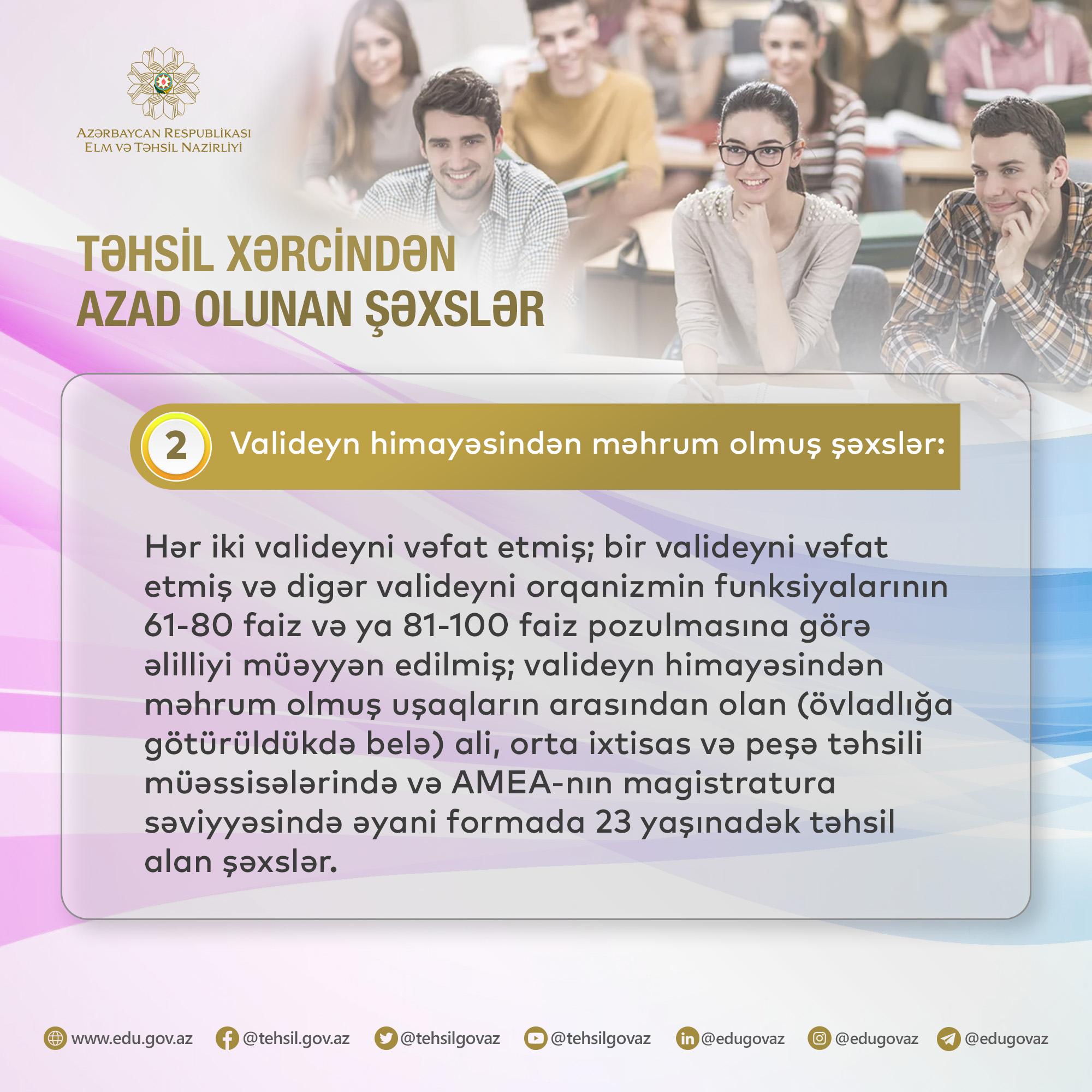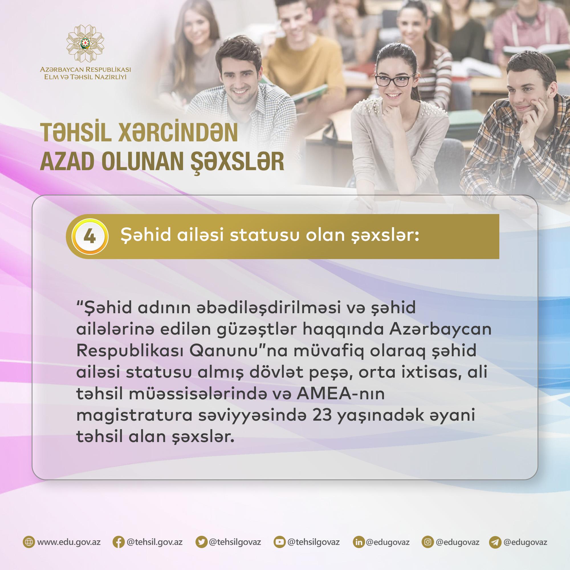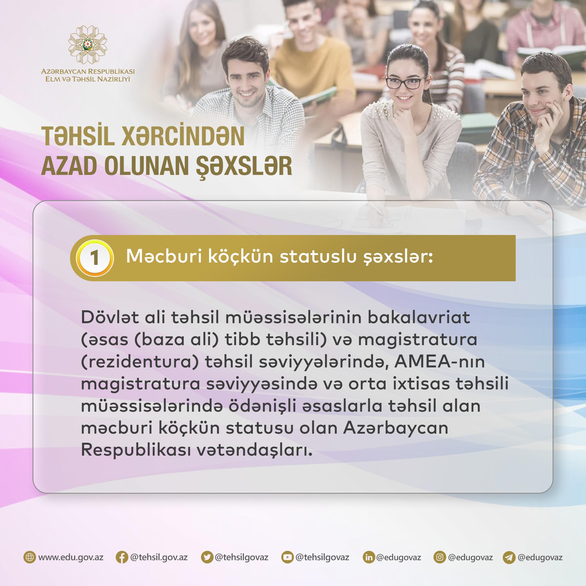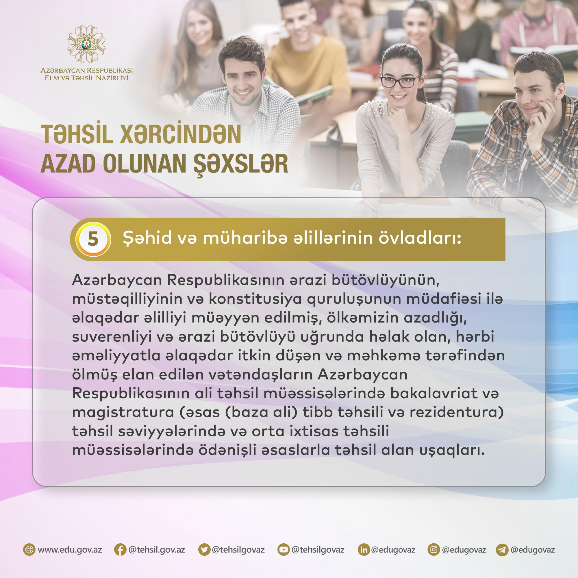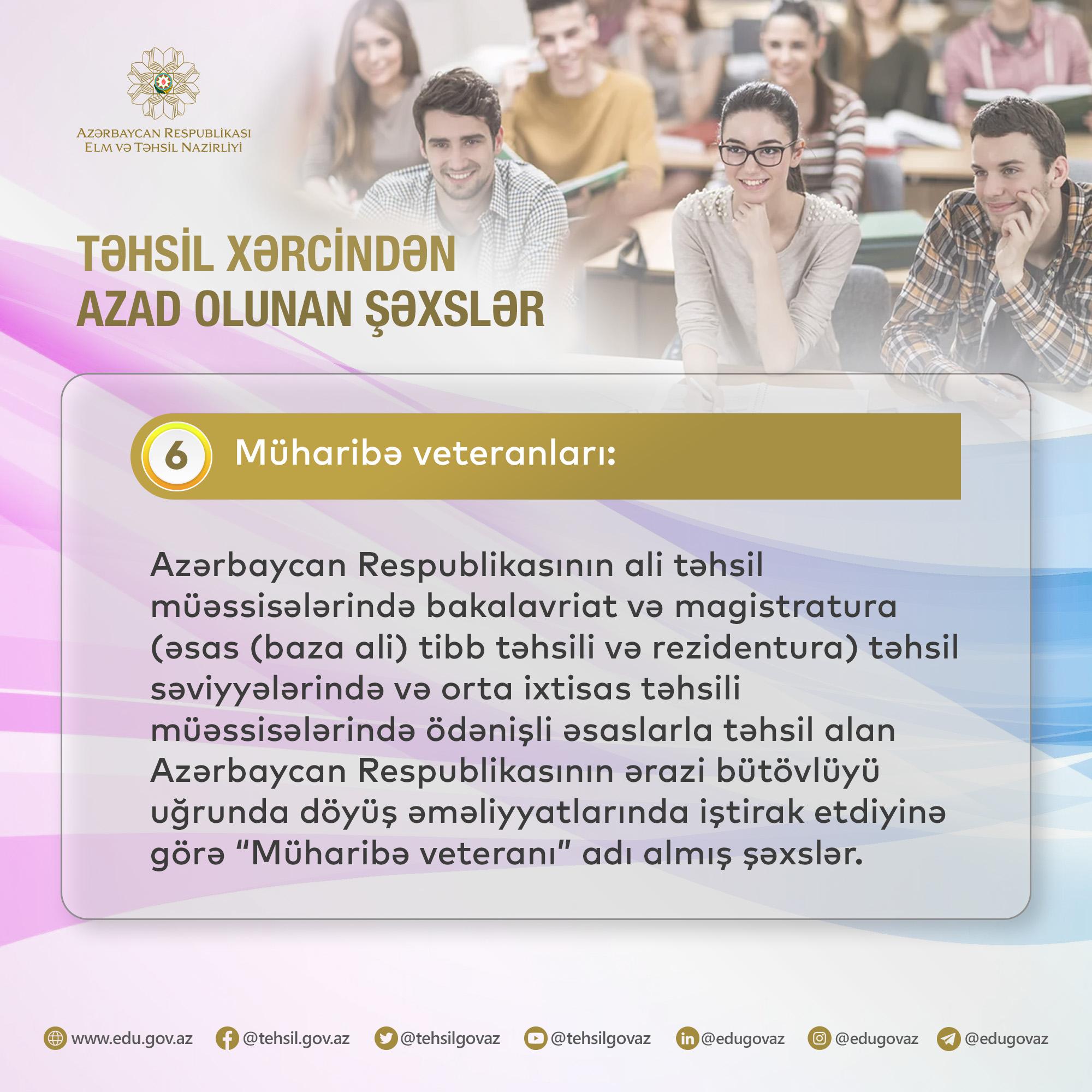 Elm və Təhsil Nazirliyi təhsilin müxtəlif pillə və səviyyələri üzrə təhsil xərcindən azad olunan imtiyazlı şəxslərin kateqoriyasını açıqlayıb. həmin şəxslər 6 kateqoriyaya bölünür. Həmin şəxslər aşağıdakılardır: