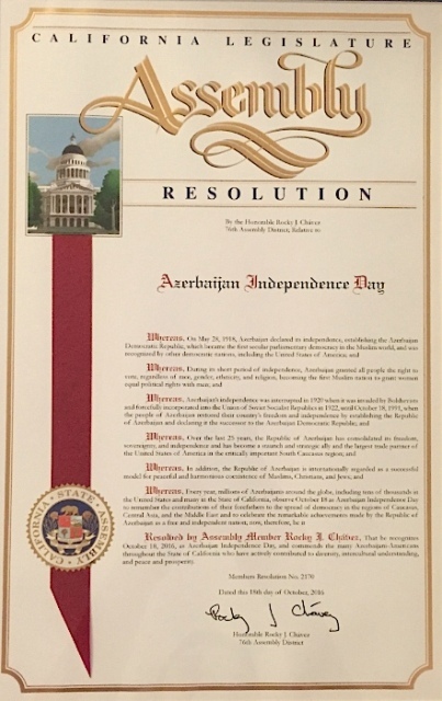 Kaliforniya Ştat Assambleyasının üzvü R.Çavez isə əldə etdiyi mütərəqqi nailiyyətlərlə Azərbaycanın son illərdə beynəlxalq aləmin diqqətini çəkdiyini, bu baxımdan San Dieqo-Bakı əlaqələrinin inkişafında maraqlı olduqlarını bildirib. Çətin bir bölgədə yerləşən və yüksək strateji önəm daşıyan Azərbaycanın ABŞ-ın yaxın tərəfdaşı və dostu olduğunu qeyd edən millət vəkili, bu dostluq münasibətlərini dəstəklədiyini və bu əlaqələrin daha da güclənməsini arzu etdiyini bildirib. Çıxışının sonunda Azərbaycanın müstəqillik günü ilə bağlı R.Çavez Kaliforniya Ştat Assambleyasının fərdi qətnaməsni təqdim edib.