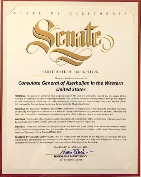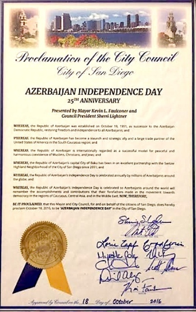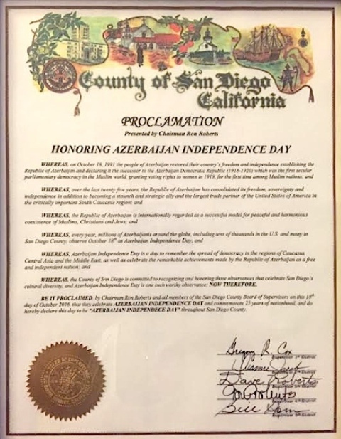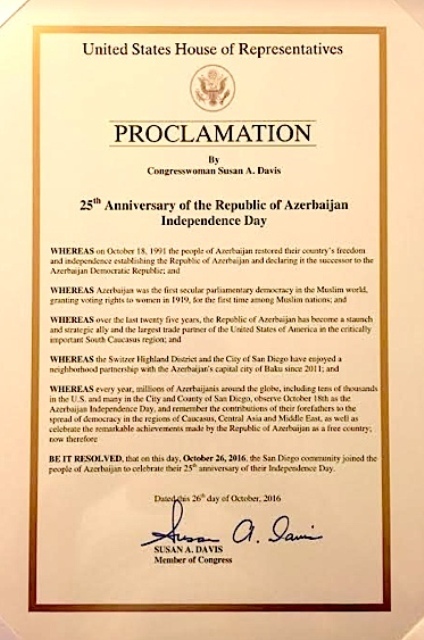 Tədbirdə ABŞ Konqresmeni Suzan Deyvis, Kaliforniya Ştat Senatoru Coel Anderson və San Dieqo Vilayəti adından bəyannamələr təqdim olunub. Bəyannamələrdə Azərbaycanın əldə etdiyi nailiyyətlər alqışlanır və ölkəmizin strateji önəmi qeyd olunur.