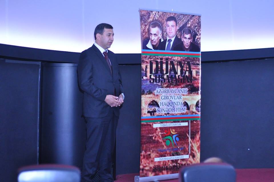 Tədbiri giriş sözü ilə açan İslahatçı Gənclər İctimai Birliyinin sədri Fərid Şahbazlı azərbaycanlı girovlar barədə danışıb və film barədə qısa məlumat verib. Daha sonra "Dünya susmasın!" sənədli filmi nümayiş etdirilib. İslahatçı Gənclər İctimai Birliyinin təşkilati dəstəyi və ShushaPost.az İnformasiya Portalının informasiya dəstəyi ilə hazırlanmış "Dünya susmasın!" sənədli filmi öz dədə-baba torpaqlarından didərgin düşmüş üç azərbaycanlı - Dilqəm Əsgərov, Şahbaz Quliyev və Həsən Həsənov barədədir. 2014-cü ilin İyul ayında erməni silahlı birləşmələri tərəfindən girov götürülən və sonradan qətlə yetirilən Həsən Həsənov, üzərində saxta məhkəmə prosesi təşkil olunan Dilqəm Əsgərov və Şahbaz Quliyevin həyat yolu haqqında danışılan sənədli filmdə girovların yaxınları və ailə üzvləri danışır, habelə azərbaycanlı girovların azadlığa buraxılması məqsədilə həyata keçirilən işlər barədə məlumat verilir. Təqdimat mərasimində çıxış edən millət vəkili Qənirə Paşayeva azərbaycanlı girovlar barədə məlumat verib, onların azadlığa buraxılması istiqamətində görülən işlərdən danışıb və Azərbaycan dövlətinin girovların azadlığa çıxması üçün atdığı addımlardan söz açıb. Qərb dünyasının Azərbaycana münasibətdə tətbiq etdiyi ikili standartlardan danışan Qənirə Paşayeva ölkə başçısı cənab İlham Əliyevin azərbaycanlı girovların azadlığa buraxılması üçün zəruri göstərişlər verdiyini və dövlətin bu istiqamətdə lazımi addımlar atdığını vurğulayıb. Daha sonra çıxış dən YAP Gənclər Birliyinin sədri Seymur Orucov Dağlıq Qarabağ münaqişəsi və onun Azərbaycana vurduğu zərərlər barədə danışıb, Dağlıq Qarabağ münaqişəsinin Azərbaycan dövlətinin daxili və xarici siyasətində prioritet olduğunu bildirib və azərbaycanlı girovların azadlığa çıxması üçün rəsmi Bakının gördüyü işlər barədə məlumat verib. Gənclər üçün Təhsil Mərkəzinin sədri Fəxrəddin Həsənzadə bugünkü gənclərin milli vətənpərvərlik ruhunda tərbiyə olunduğunu, ölkəmizin bütovlüyü uğrunda canından keçməyə hazır olan gənclərimizin hər zaman əldə silah Ali Baş Komandanın əmrini gözlədiyini deyib. Tədbirdə çıxış edən "Aşıq Şəmşir" Mədəniyyət Ocağı İctimai Birliyinin sədr müavini, Kəlbəcər ictimaiyyətinin nümayəndəsi Həbib Misirov filmin ərsəyə gəlməsində zəhməti olan hər kəsə təşəkkürünü bildirib, Kəlbəcər ictimaiyyətinin, habelə "Aşıq Şəmşir" Mədəniyyət Ocağı İctimai Birliyinin sədri Qənbər Şəmşiroğlunun və Kəlbəcərdən seçilmiş millət vəkili Cavid Qurbanovun minnətdarlıqlarını çatdırıb. Qeyd edək ki, azərbaycanlı girovlar haqqında hazırlanmış "Dünya susmasın!" filminin ingilis, rus, erməni, alman, fransız və Türk dillərinə tərcümə edilib yayılması və xarici ölkələrdə təqdim edilməsi planlaşdırılır.