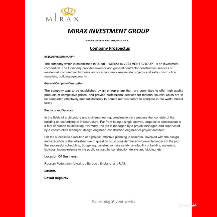 Həmin "maliyyə sənədləri"nin bir nüsxəsində redaksiyamıza təqdim edən Merim Beishekeyevanın müdafiəçisi Abdulla Əfəndizadə bildirib ki, tez-tez xarici ölkələrdə olmuş, o cümlədən son 3 ildə Türkiyədə bizneslə məşğul olmuş, Bakı ş-ri, Səbail r-n, T.Əliyarbəyov küç, ev 10, mənzil 26-da qeydiyyatda olan Bağırov Davud Zöhrab oğlunun "maliyyə sənədlərindən” məlum olur ki, o həm rəsmi, həm də qeyri-rəsmi rəhbəri olduğu Mirax İnvestment, Global arketing, My Parcel LLC, Potok General Trading şirkətləri vasitəsilə Avropada: