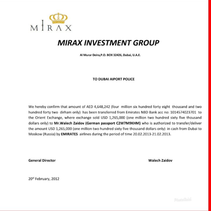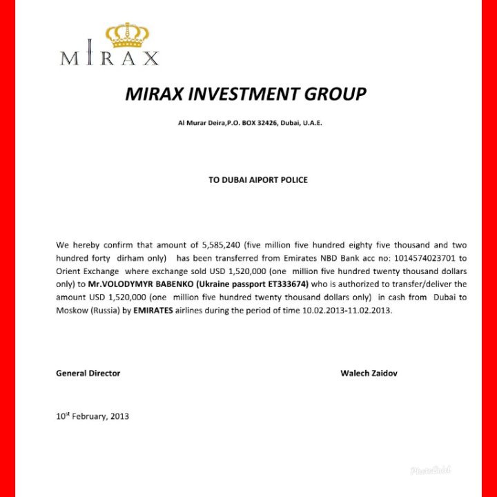 Merim Beishekeyevanın (Beyşekeyeva) nümayəndəsi Abdulla Əfəndizadə onu da qeyd edib ki, sənədlərdə qeyd edilən banklara göndəriləcək sorğulardan başqa həm Bağırov Davud Zöhrab oğlu və təqdim edilən sənədlərdə olan şəxslərə dair Rusiya Federasiyasının Aeroportlarının (əsasən Şeremetyevo, nadir hallarda Domodedovo olub) gömrüklərinə, həmçinin Dubay Aeroportunun (1-ci Terminal, nadir hallarda 3-cü Terminal) gömrüyünə əlavə Sorğular göndərərkən saxta müşayət olunan sənədlərin və gündəlik pul daşımalarının məbləğin müəyyən etmək olar.
