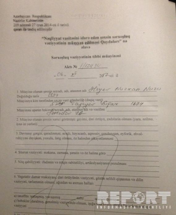 Araşdırma zamanı məlum olub ki, avtomobil "Nurgün Motors” şirkətlər qrupuna məxsusdur. Sürücü və sərnişinin isə qanunvericilikdə nəzərdə tutulan qaydada avtomobili idarə etmək hüququ yoxdur. Onlar asayiş keşikçilərinə göstərdikləri müqavimətə görə Nəsimi Rayon Polis İdarəsinin 22-ci Polis bölməsinə aparılıb. Bundan sonra sərnişin N.Əliyev Respublika Narkoloji Mərkəzinin alkoqol sərxoşluğunu təyinetmə məntəqəsinə dəvət edilib. Məntəqədə həkim yoxlanışı zamanı onun sərxoş olduğu müəyyən edilib.
