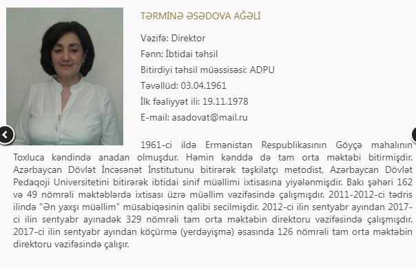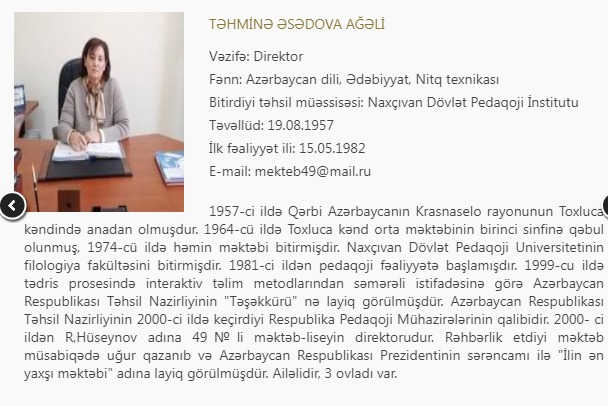 Bu ilin fevral ayında töhmət alan Bakı şəhərində fəaliyyət göstərən 49 nömrəli "İntellekt” məktəb-liseyinin direktoru Təhminə Əsədova ilə bağlı sosial şəbəkələrdə daha bir şikayət yayılıb.