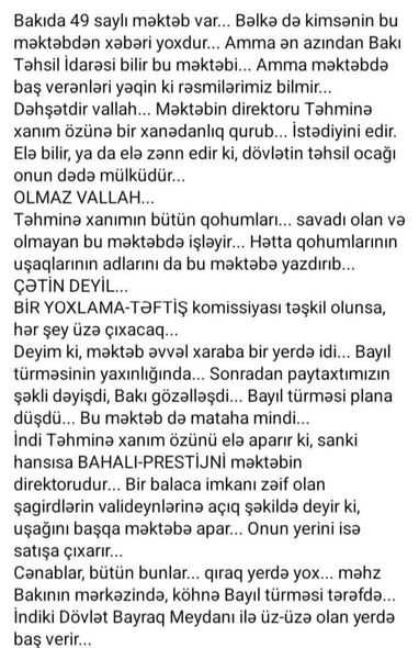 İddia edilib ki, məktəbin direktoru Təhminə Əsədova orada xanədanlıq quraraq, qohumlarını təhsil ocağına işə düzəldir, eyni zamanda, pul qarşılığında şagird yerini satır. Nəticədə orada təhsil almaq istəyən şagirdlər kənarda qalırlar.