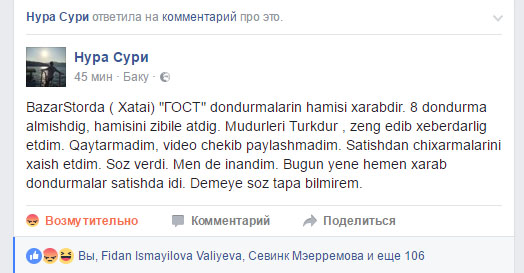 Tanınmış müğənni Nura Suri öz səhifəsində maraqlı şərh paylaşıb. Şərhi olduğu kimi təqdim edirik: "BazarStorda ( Xatai) "ГОСТ" dondurmalarin hamisi xarabdir. 8 dondurma almishdig, hamisini zibile atdig. Mudurleri Turkdur , zeng edib xeberdarlig etdim. Qaytarmadim, video chekib paylashmadim. Satishdan chixarmalarini xaish etdim. Soz verdi. Men de inandim. Bugun yene hemen xarab dondurmalar satishda idi. Demeye soz tapa bilmirem."