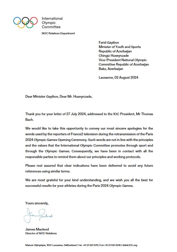 Nazirliyin İctimaiyyətlə əlaqələr şöbəsindən bildirilib ki, cavab məktubunda Beynəlxalq Olimpiya Komitəsi Paris-2024 Yay Olimpiya Oyunlarının açılış mərasiminin şərhi zamanı "France2" telekanalının müxbirinin işlətdiyi ifadələrə görə Azərbaycandan üzr istəyib.