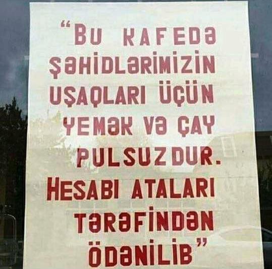 Sosial şəbəkələrdə maraqlı foto yayılıb. 7News.az xəbər verir ki, şəhidlərə həsr olunmuş foto izləyicilərin mrağına səbəb olub. Belə ki, fotoda "Bu kafedə şəhidlərimizin uşaqları üçün yemək və çay pulsuzdur. Hesabları ataları tərəfindən ödənilib" yazılıb. 7News.az