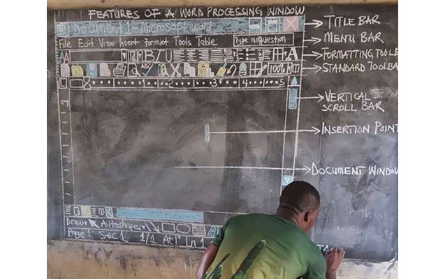 Qana məktəblərinin birində dərs deyən Richard Appiah adlı müəllim sinifdə kompüter olmadığı üçün Microsoft proqramını lövhədə izah edib.