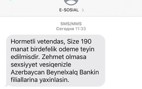 Birdəfəlik ödəməni almaq üçün vətəndaşlara daxil etdikləri nömrələr üzrə SMS göndərilir.