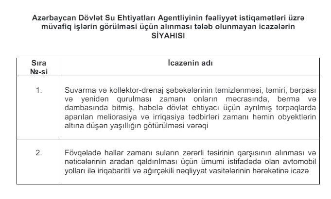 Prezident İlham Əliyev "Azərbaycan Dövlət Su Ehtiyatları Agentliyinin fəaliyyət istiqamətləri üzrə müvafiq işlərin görülməsi üçün alınması tələb olunmayan icazələrin siyahısı”nın təsdiq edilməsi haqqında fərman imzalayıb.