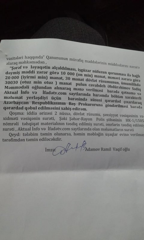 Düzdür, oğlum onu döyənlərdən deyil, sifariş verən caninin tapılıb cəzalandırması üçün 26 noyabrda yenidən şikayət vermişdir. Və hazırda da Şəki polisində araşdırma formal olaraq davam edir. Bunu görən DYP polisi Ramil Adamov dekabrın 24-dək oğlumun qaynatası Ziyəddinə və digər şəxslərə zənglər edərək yenə şikayətini geri götürməsini onun bu döyülmə işinə aidiyyatının olmamasını bildirmiş və Şəki DYP idarəsinə dəvət edərək onun avtomobilinə dəymiş zərərəi ödəməyə hazır olduğunu bildirmişdir. Oğlumun bu şərtlərlə razılaşmadığını bildikdən dərhal sonra R.Adamov vəziyyətdən çıxış yolu kimi Sadiqi qorxutmaq və cəzalandırmaq üçün onun barəsində iddia qaldırararaq ona dəymiş 10000 manat maddi və 20000 manat mənəvi ziyanın ödənilməsi tələbi ilə Şəki məhkəməsinə müraciət etmişdir. Maraqlı burasıdır ki, iddia elə verildiyi gün, 24 dekabrda hakim Pərviz Hacıyevin icraatına verilmiş və dərhal da bildiriş poçtla göndərilərək ildırım sürətilə yeni ilin birinci iş gününə hazırlıq iclası təyin olunmuşdur. Bundan artıq sifariş necə olur, hörmətli mənim qohumum Fikrət Məmmədov? Nəticəsi əvvəldən bəlli olan məhkəmədə Ramil Adamovun məqsədi budur ki, sentyabr ayında mənə verilən şəhid oğlum Faiqin "qan pulu” olan 11000 manat pulu bu formada ələ keçirsin. Amma onun tələb etdiyi 30000 manat pulun hamısını vermək iqtidarında deyilik axı.