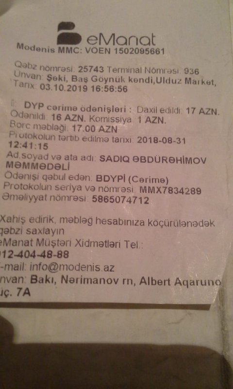 Sadiq yaxındakı "Ulduz” marketdəki aparatda cəriməni ödəməyə tanışını göndərir. O saat 16-50 dəqiqədə 16 manat cəriməni ödəniş edib gələndə, polis R. Adamov qəbzə baxmadan avtomobiliə oturub özbaşına sürüb gedirlər., Oğlum da DİN-nin 102 xidmətinə zəng edir.