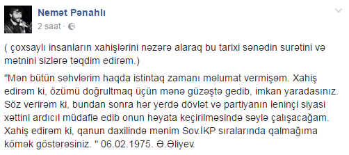 Onun paylaşdığı məktubda deyilir: "Mən bütün səhvlərim haqda istintaq zamanı məlumat vermişəm. Xahiş edirəm ki, özümü doğrultmaq üçün mənə güzəştə gedib, imkan yaradasınız. Söz verirəm ki, bundan sonra hər yerdə dövlət və partiyanın leninçi siyasi xəttini ardıcıl müdafiə edib onun həyata keçirilməsində səylə çalışacağam. Xahiş edirəm ki, qanun daxilində mənim Sov.İKP sıralarında qalmağıma kömək göstərəsiniz. 06.02.1975. Ə.Əliyev”.
