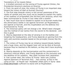 Onun sözlərinə görə, Donald Trampın qələbəsi Qərb ölkələrində yaşayan müsəlmanların yaşamını ağırlaşdıracaq: "Beləliklə, müsəlmanlar təqiblərə və repressiyalara dözməyərək mübarizəyə qalxacaqlar, bizə qatılacaqlar, sıralarımızda olacaqlar".
