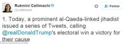 "Bu insan ABŞ-ın prezidenti postunda bizim arzuladığımız adamdır. Allah onu saxlasın! İnşallah, Trampın yürüdəcəyi xarici siyasət bizi daha da möhkəmləndirəcək, gücləndirəcək. Mücahidləri təbrik edirəm!", - "Cəbhət ən Nüsra"nın liderlərindən biri Twitter-dəki profilində paylaşdjığı bəyanatında yazıb.