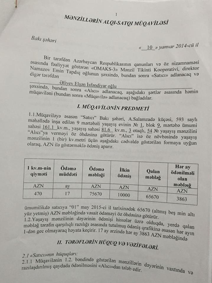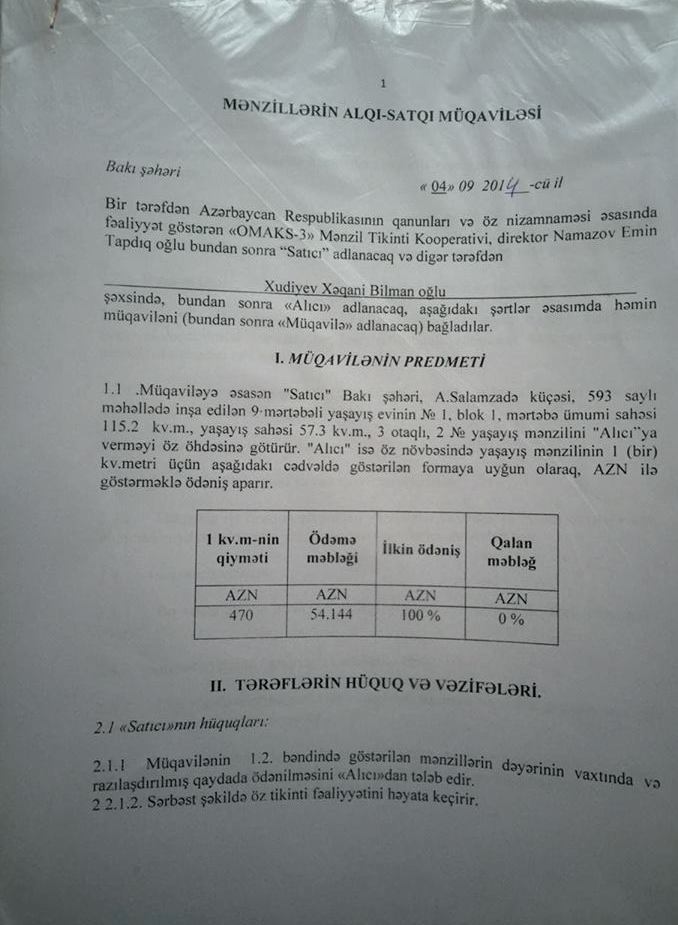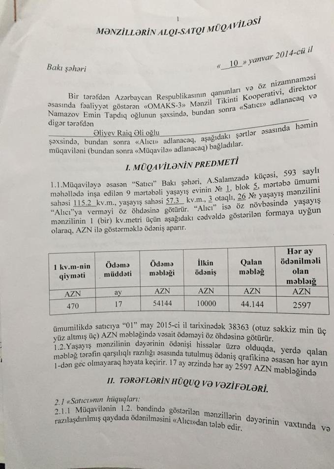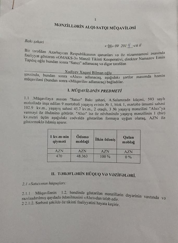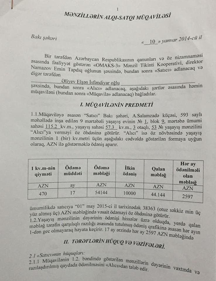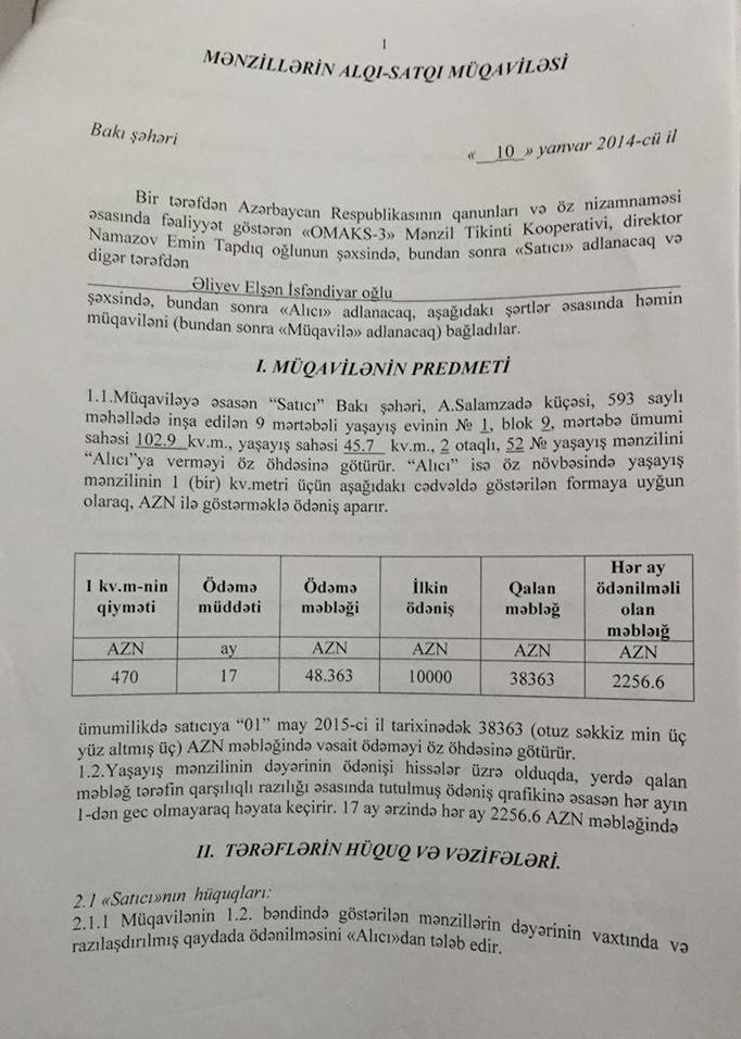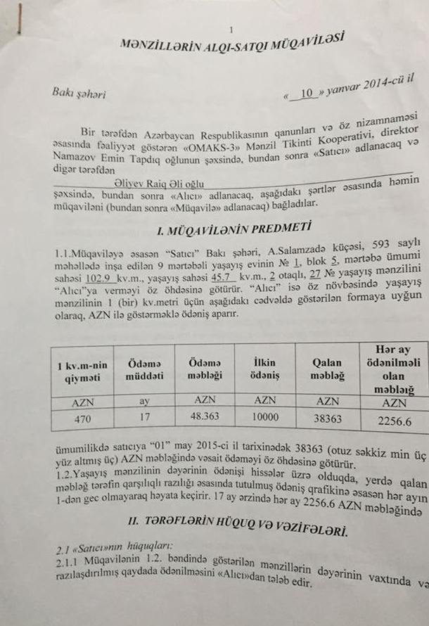 Aşağıda Natiq Əliyevin və Mahir Xudiyevin qardaşlarına və qardaşları uşaqlarına "satılan” evlərin müqavilə səənədlərini təqdim edirik: