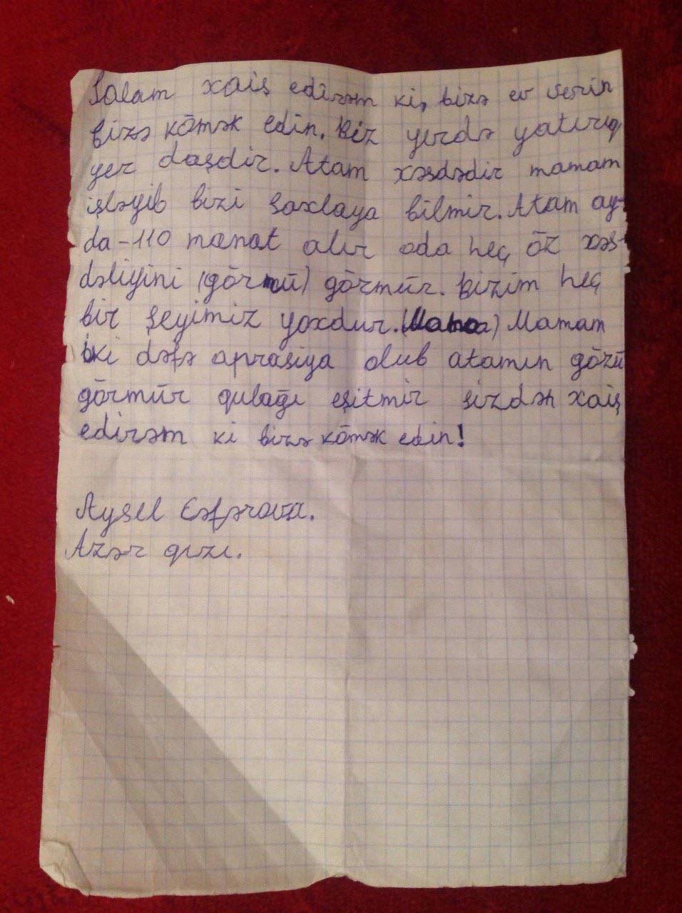 "Salam. Xahiş edirəm ki, bizə ev verin, bizə kömək edin. Biz yerdə yatırıq, yer daşdır. Atam