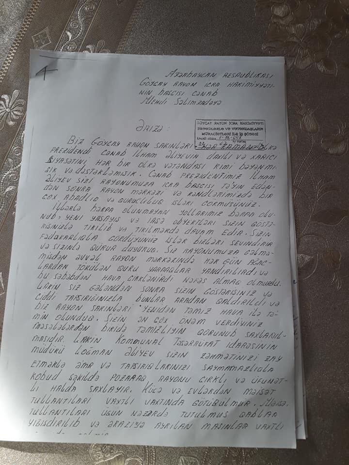 Göyçay rayon icra başçısı: Mehdi Səlimzadəyə ünvanlanmış məktub