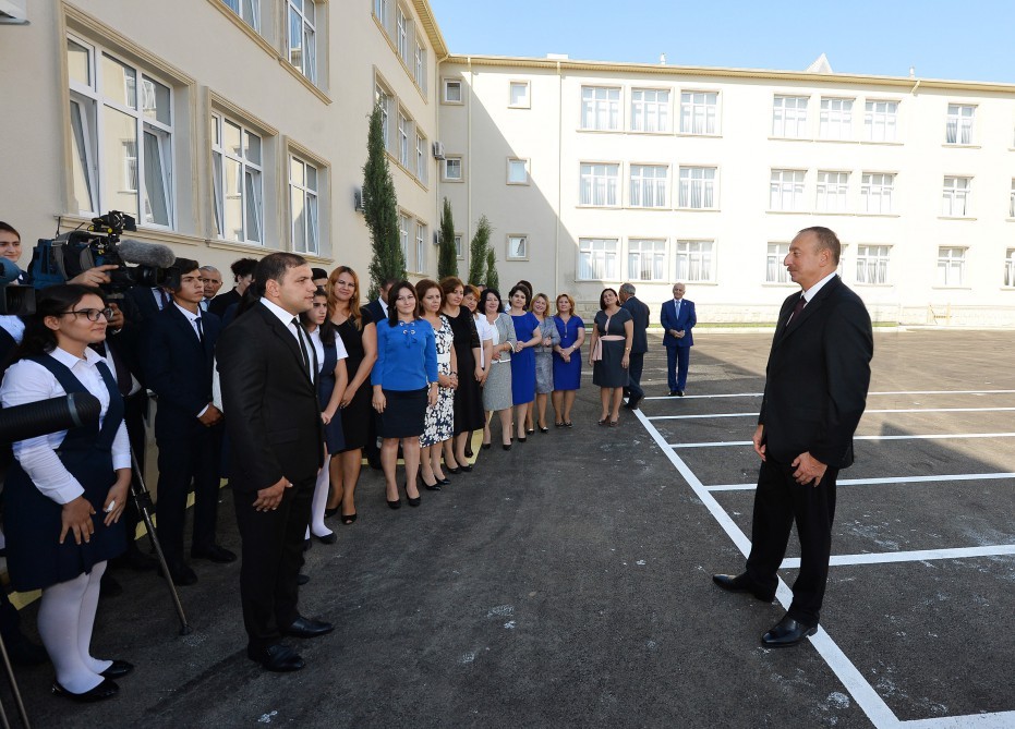 - Salam, sabahınız xeyir olsun. Sizi ürəkdən salamlayıram. Bu gün ölkəmizdə yeni dərs ili başlayır. Bu münasibətlə sizi təbrik edirəm. Eyni zamanda, bu gün məktəbin həyatında çox əlamətdar bir gündür. Məktəbin yeni binası tikilib istifadəyə verilir. Bu münasibətlə də sizi təbrik edirəm.