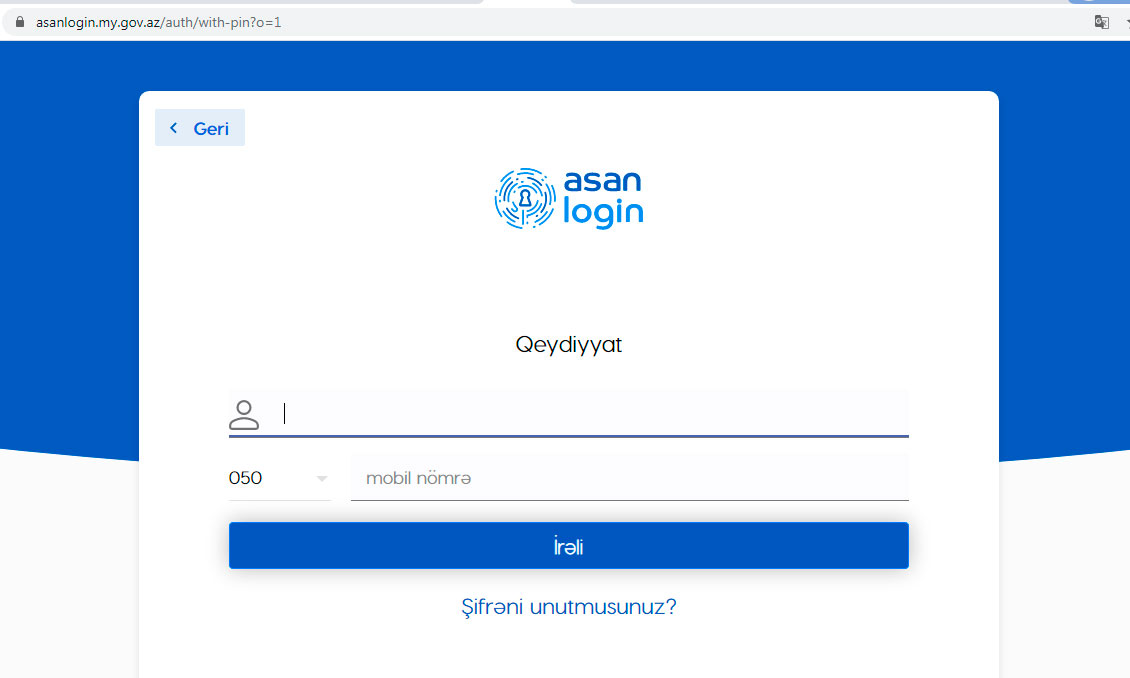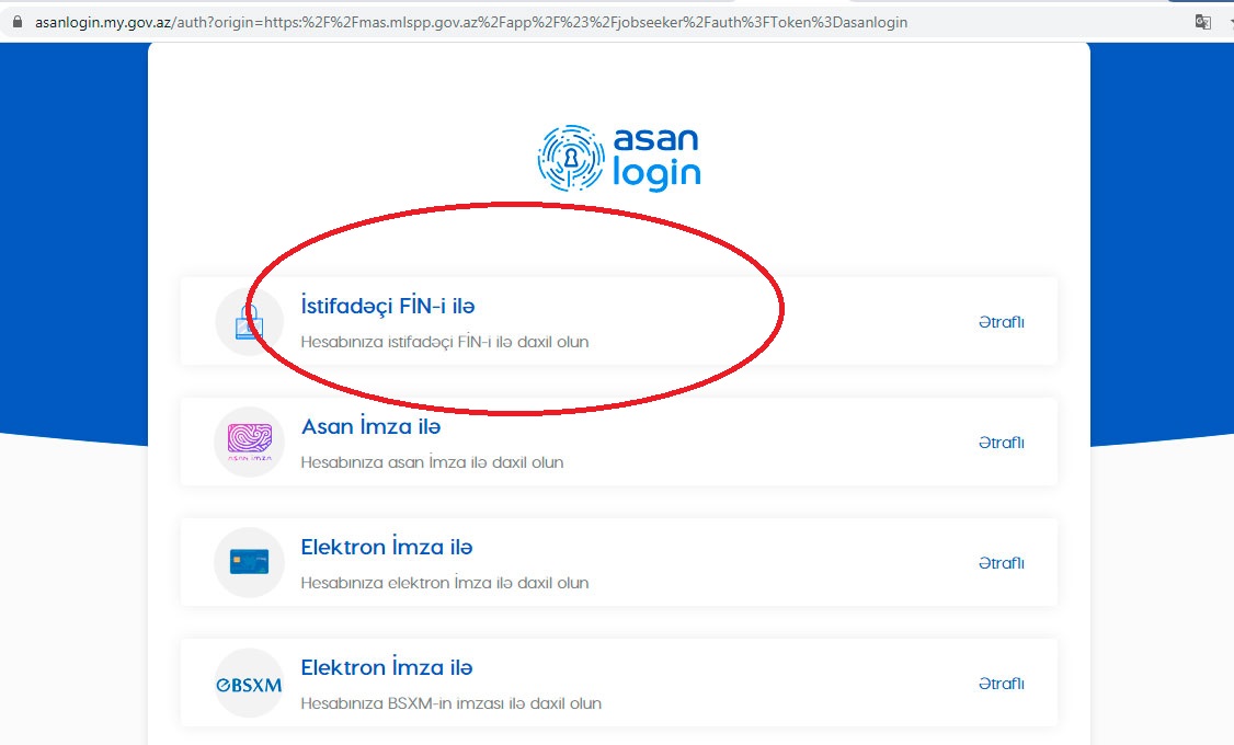 4. Əgər asan imza və ya elektron imzanız yoxdursa, onda istifadəçi Fərdi İdentifikasiya Nömrəsi (FİN) ilə daxil olmalısınız.