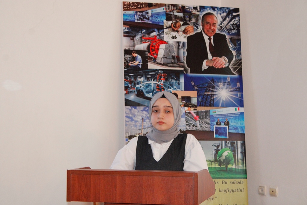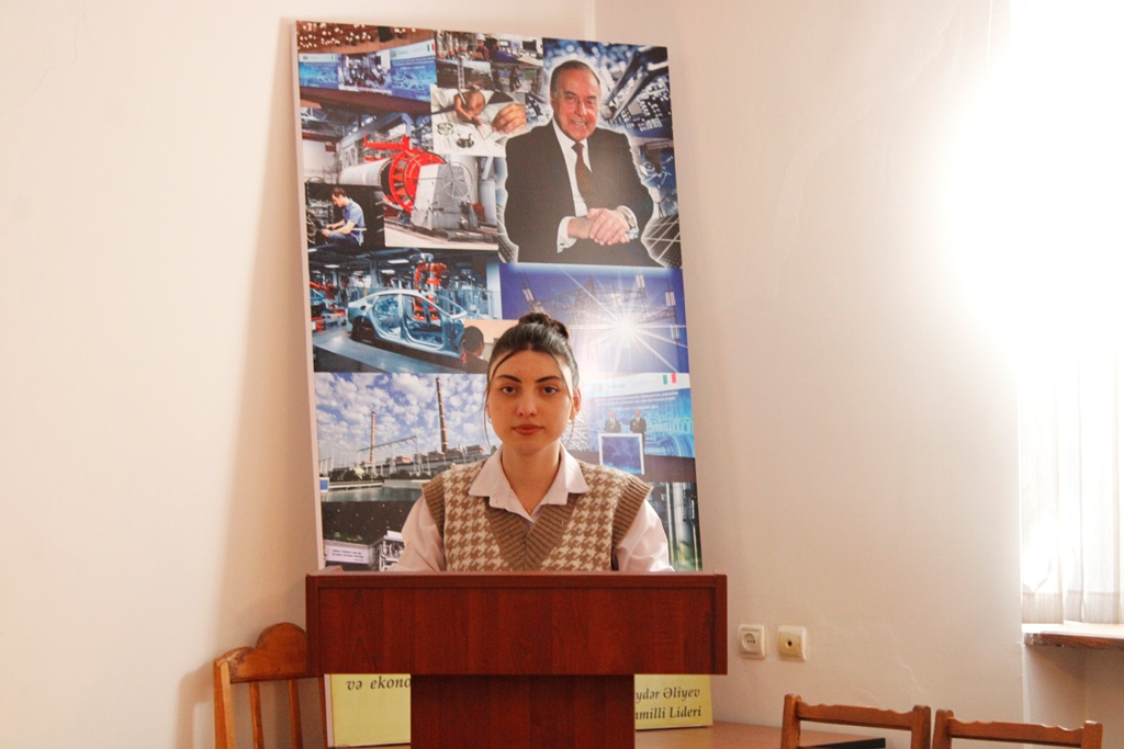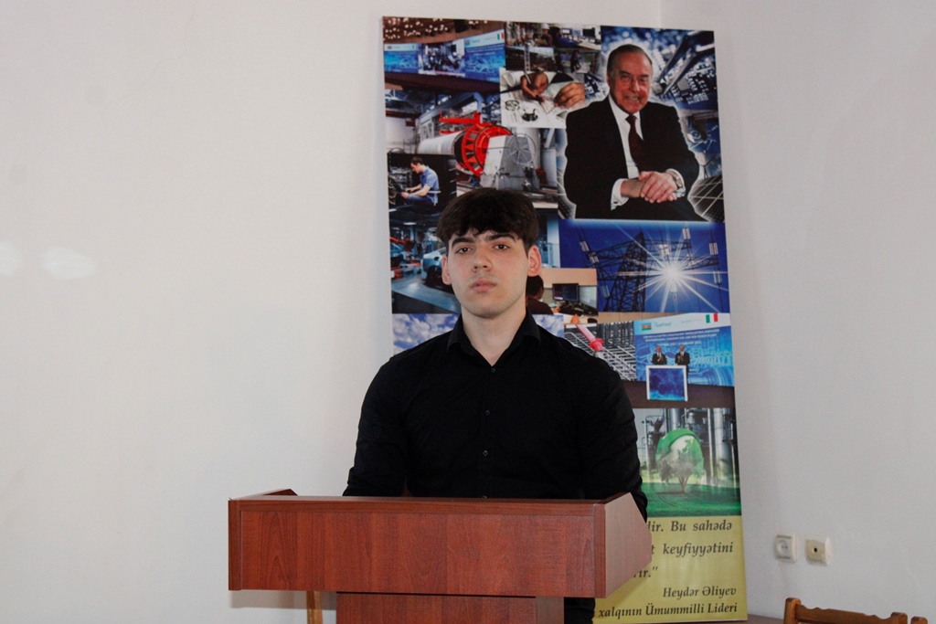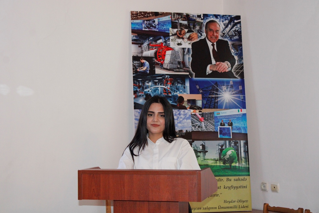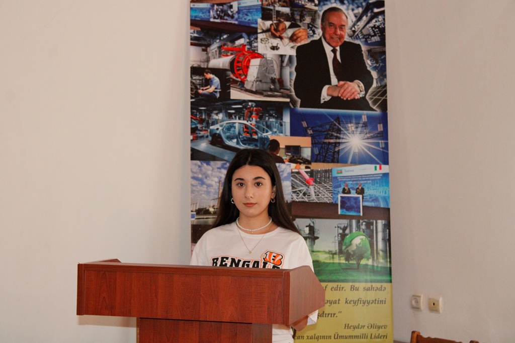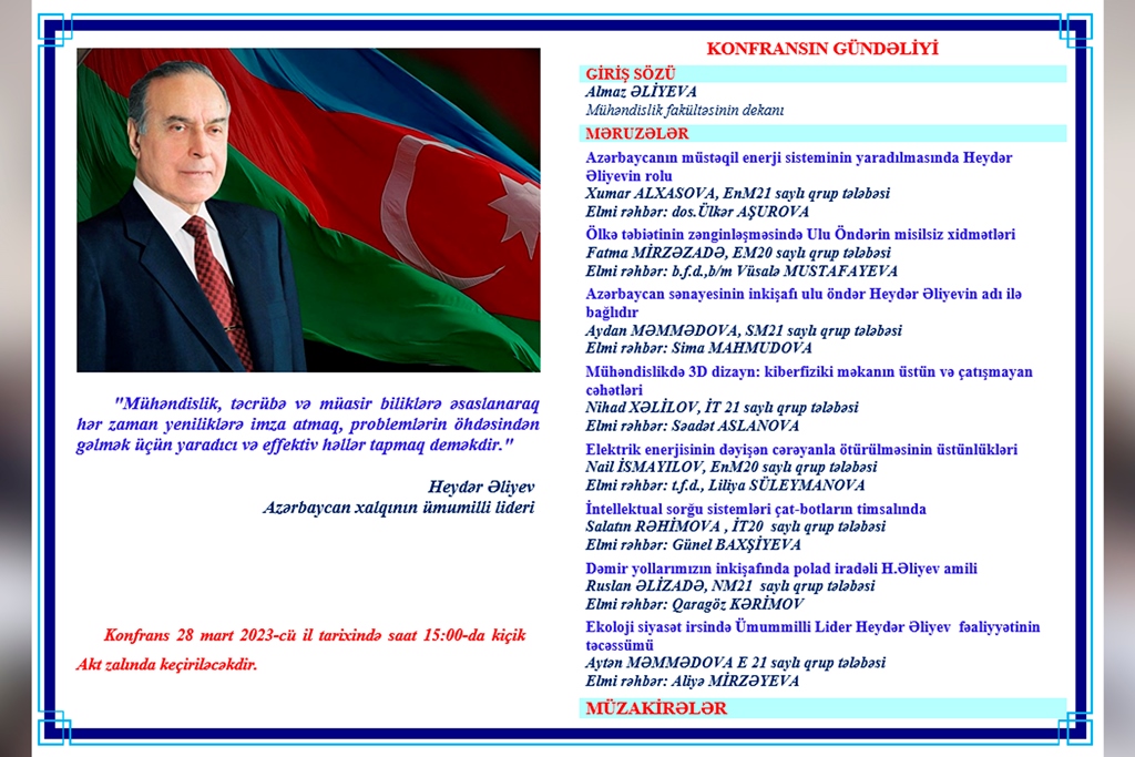 Daha sonra məruzələr dinlənilib. MDU-nun Mühəndislik fakültəsinin tələbələrindən Xumar Alxasova "Azərbaycanın müstəqil enerji sisteminin yaradılmasında Heydər Əliyevin rolu”, Fatma Mirzəzadə "Ölkə təbiətinin zənginləşməsində Ulu Öndərin misilsiz xidmətləri”, Aydan Məmmədova "Azərbaycan sənayesinin inkişafı ulu öndər Heydər Əliyevin adı ilə bağlıdır”, Nihad Xəlilov "Mühəndislikdə 3D dizayn: kiberfiziki məkanın üstün və çatışmayan cəhətləri”, Nail İsmayılov "Elektrik enerjisinin dəyişən cərəyanla ötürülməsinin üstünlükləri”, Salatın Rəhimova "İntellektual sorğu sistemləri çat-botların timsalında”, Ruslan Əlizadə "Dəmir yollarımızın inkişafında polad iradəli H.Əliyev amili və Aytən Məmmədova "Ekoloji siyasət irsində Ümummilli Lider Heydər Əliyev fəaliyyətinin təcəssümü” mövzularında məruzələrlə çıxış ediblər.