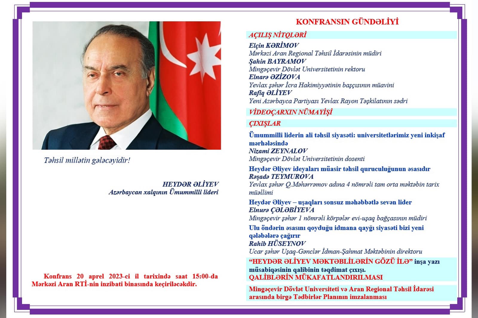 2023-cü ilin aprelin 20-də Mingəçevir Dövlət Universiteti (MDU), Mərkəzi Aran Regional Təhsil İdarəsi (RTİ) və Yevlax Şəhər İcra Hakimiyyətinin (ŞİH) birgə təşkilatçılığı ilə "Heydər Əliyev və Azərbaycan təhsili” mövzusunda elmi-praktik konfrans keçirilib. Mərkəzi Aran RTİ-nin evsahibliyi etdiyi konfrans "Heydər Əliyev İli” çərçivəsində baş tutub.