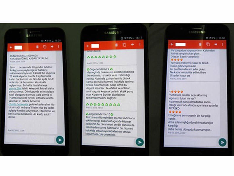 7News.az hürriyet-ə istinadən xəbər verir ki, Eagle-dakı mesajlaşmada FETÖ-çü qadın "Maşında yanıma Hz. Xədicə anamız əyləşdi, həbsxanaya gedənə qədər əlimi buraxmadı. Mənə "Qızım, niyə bu qədər ağlayıb özünü üzürsən?! Rəbbimiz və biz sizinləyik, səbr edin, az qaldı" dedi" sözlərini yazıb.