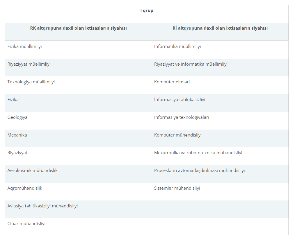 Dövlət İmtahan Mərkəzindən 7News.Az-a verilən məlumata görə, bu qrup daxilində bütün ixtisaslar üzrə müsabiqədə iştirak etmək istəyən abituriyentlər isə II mərhələdə riyaziyyat, fizika və kimya fənləri üzrə imtahan verdikdən sonra əlavə olaraq informatika fənnindən fərq imtahanı verəcəklər. Beləliklə, abituriyentlər ali təhsil müəssisələrinə sənəd qəbulu zamanı I ixtisas qrupu üzrə elektron ərizə doldurarkən, öz istəklərinə uyğun olaraq ərizələrində təhsil almaq istədikləri ixtisas və yaxud ixtisaslara uyğun olan iki altqrupdan birini, yaxud hər iki altqrupu seçmək imkanına malik olacaqlar.