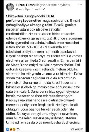 7news.az-a xanım istifadəçinin paylaşımını oxucularına təqdim edir: "8 mart öncəsi hədiyyə almaq üçün Sumqayitdaki "İDEAL PerfumeryCosmetics” dükanına getmişdim. Əvvəlki günlərə nisbətən adam çox idi deyə, saticilar xidmət göstərməyə catdirmirdilar. Hətta onlardan birinə müraciət edəndə (eynekli qarayaniz qiz idi) həmən hansı qiymətə ətir almaq istədiyimi soruşdu, halbuki ondan məsləhət istəməmişdim.50 – 100 AZN civarinda ətir istədiyimi biləndə ağız büzüb uzaqlaşdi.