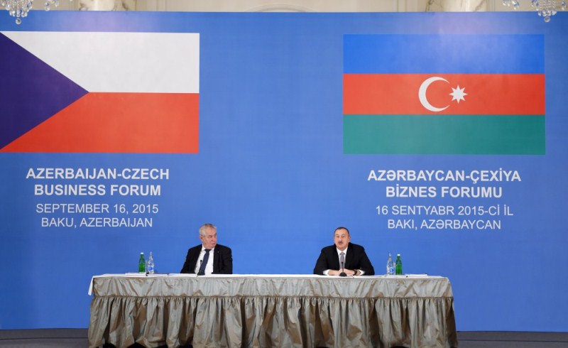 Azərbaycan-Çexiya biznes forumunda çıxış edən Prezident İlham Əliyev tədbirin iştirakçılarını salamlayaraq indiyə qədər iş adamlarımız arasında keçirilən görüşlərin əlaqələrin möhkəmlənməsinə xidmət etdiyini bildirdi. İkitərəfli münasibətlərin strateji xarakter daşıdığını deyən dövlət başçısı Prezident Miloş Zemanın səfəri çərçivəsində ölkələrimiz arasında strateji tərəfdaşlığa dair imzalanan birgə Bəyannamənin əhəmiyyətini vurğuladı. Azərbaycan-Çexiya iqtisadi əməkdaşlığının daha da inkişaf etdirilməsinin vacib olduğunu deyən Prezident İlham Əliyev biznes dairələri arasında əlaqələrin yaxşı koordinasiya olunmasının vacibliyinə toxundu. Dövlət başçısı səfər çərçivəsində Çex Respublikası banklarının ölkəmizdəki layihələrdə iştirakının müzakirə olunduğunu, Azərbaycanın maliyyə tərəfdaşı kimi öhdəliklərini uğurla yerinə yetirdiyini, gələcək illərdə əməkdaşlığın yeni sahələrinin müəyyənləşdirilməsinə ehtiyacın olduğunu diqqətə çatdırdı.