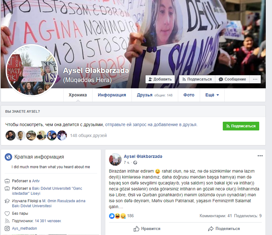 7news.az xəbər verir ki, 1996-cı il təvəllüdlü Aysel Ələkbərzadə öz şəxsi prifilində bunları yazıb: "Birazdan intihar edirəm :) rahat olun, nə siz, nə də sizinkimilər mənə lazım deyil)) kimlərəsə inandınız, daha doğrusu məndən başqa hamıya) mən də bayaq son dəfə sevgilimi qucaqlayıb, yola saldım) son bakal içki və intihar)) necə gözəl səslənir) onda görərsiniz intiharın ən gözəli necə olur)) İntiharımda isə Libre, Əsli və Qurban günahkardır) mənim üstümdə oyun oynadılar) mən isə son dəfə deyirəm, Məhv olsun Patriarxat, yaşasın Feminizm!! Salamat qalın...."