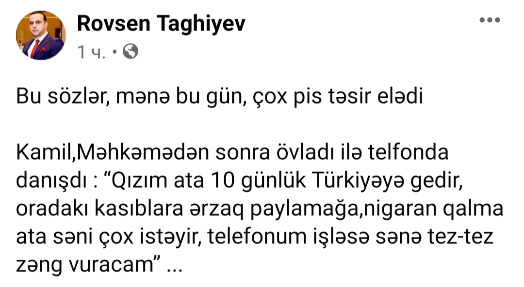 İdmançının dostu Rövşən Tağıyev Kamilin məhkəmədən sonra qızı ilə danışdığını deyib.
