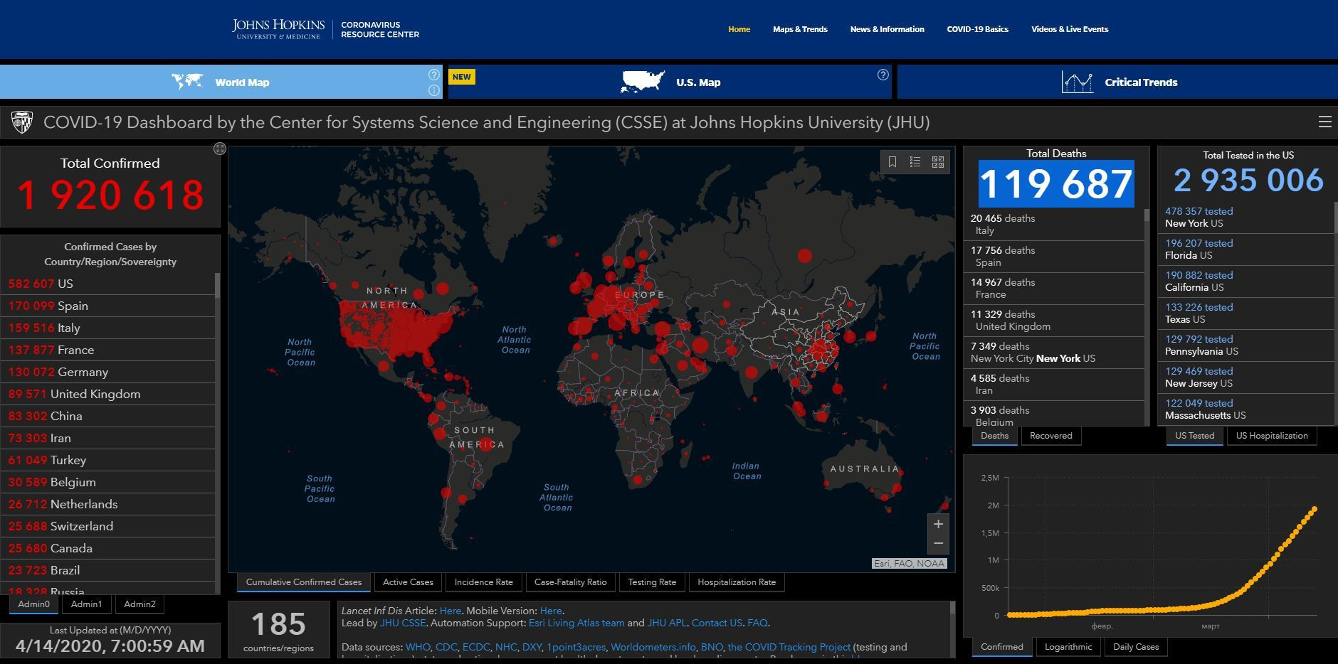 "Report” universitetin saytına istinadən xəbər verir ki, hazırda dünyada ümumilikdə 1 920 618 koronavirus xəstəsi var. Koronavirusun ilk dəfə aşkarlandığı ötən ilin dekabrından bu günə kimi ümumilikdə 119 687 nəfər bu virusdan dünyasını dəyişib.