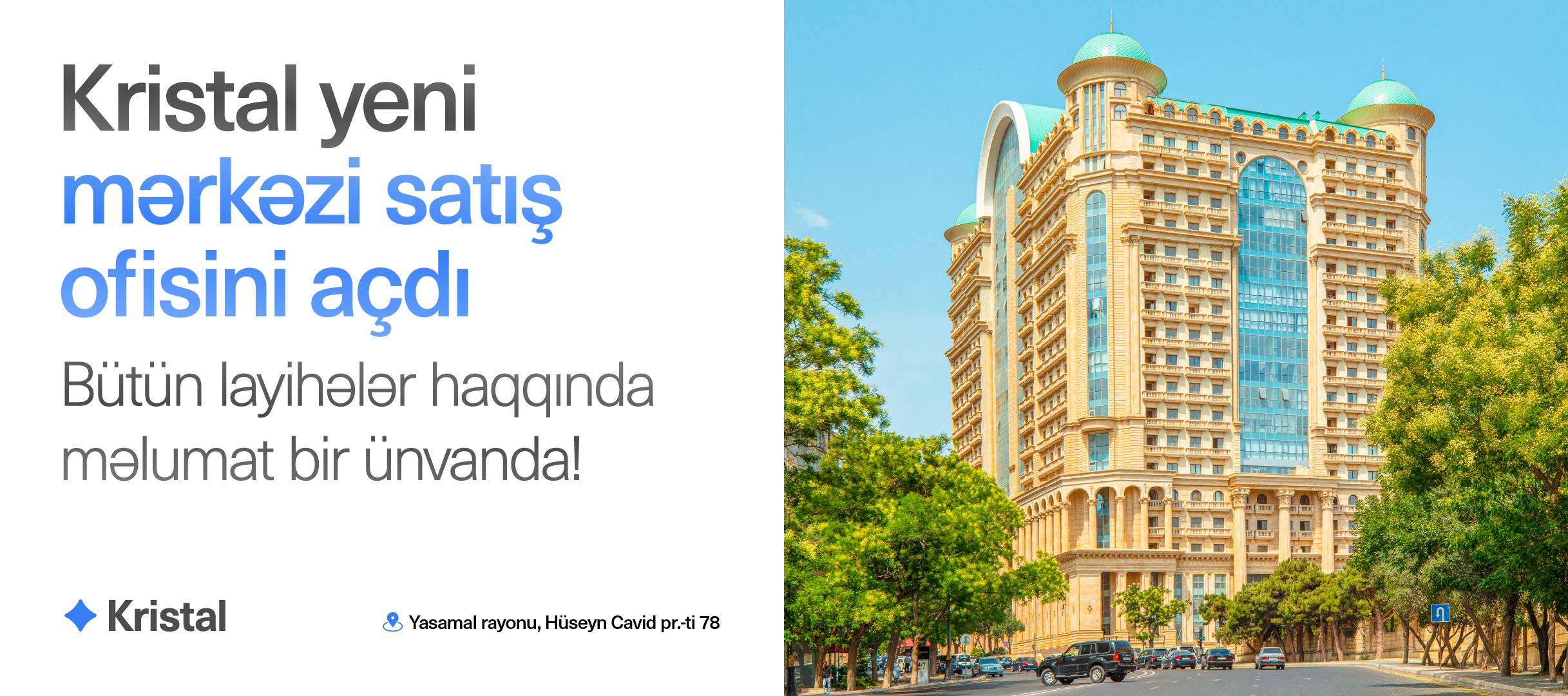 Xüsusilə qeyd etmək lazımdır ki, "Kristal”ın yeni açılmış mərkəzi satış ofisi artıq fəaliyyətə başlayıb. "Elmlər” ərazisində, "Merida Premium” layihəsində yerləşən bu ofisdə şirkətin bütün layihələri bir məkanda təqdim olunur. Müştərilər burada müxtəlif ərazilərdə yerləşən komplekslər, mənzil planları, qiymətlər və satış şərtləri ilə rahat şəkildə tanış ola, özləri üçün ən uyğun variantı müqayisəli şəkildə seçə bilərlər. Bu isə vaxt itkisini minimuma endirərək qərar vermə prosesini xeyli asanlaşdırır.